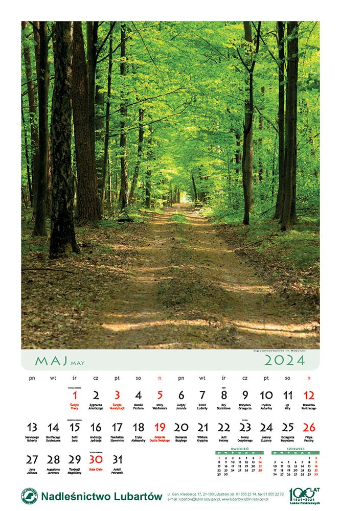 Pod koniec 2023 roku wykonaliśmy kalendarz ścienny Nadleśnictwa Lubartów na 2024 rok. Na 13 planszach formatu 40x60 cm prezentuje on wybrane walory przyrodnicze tego nadleśnictwa oraz pejzaże leśne na przestrzeni wszystkich pór roku. Autorami zdjęć są: Wiesław Lipiec i Rafał Siek. Kalendarz został wydany na zlecenie Nadleśnictwa Lubartów.